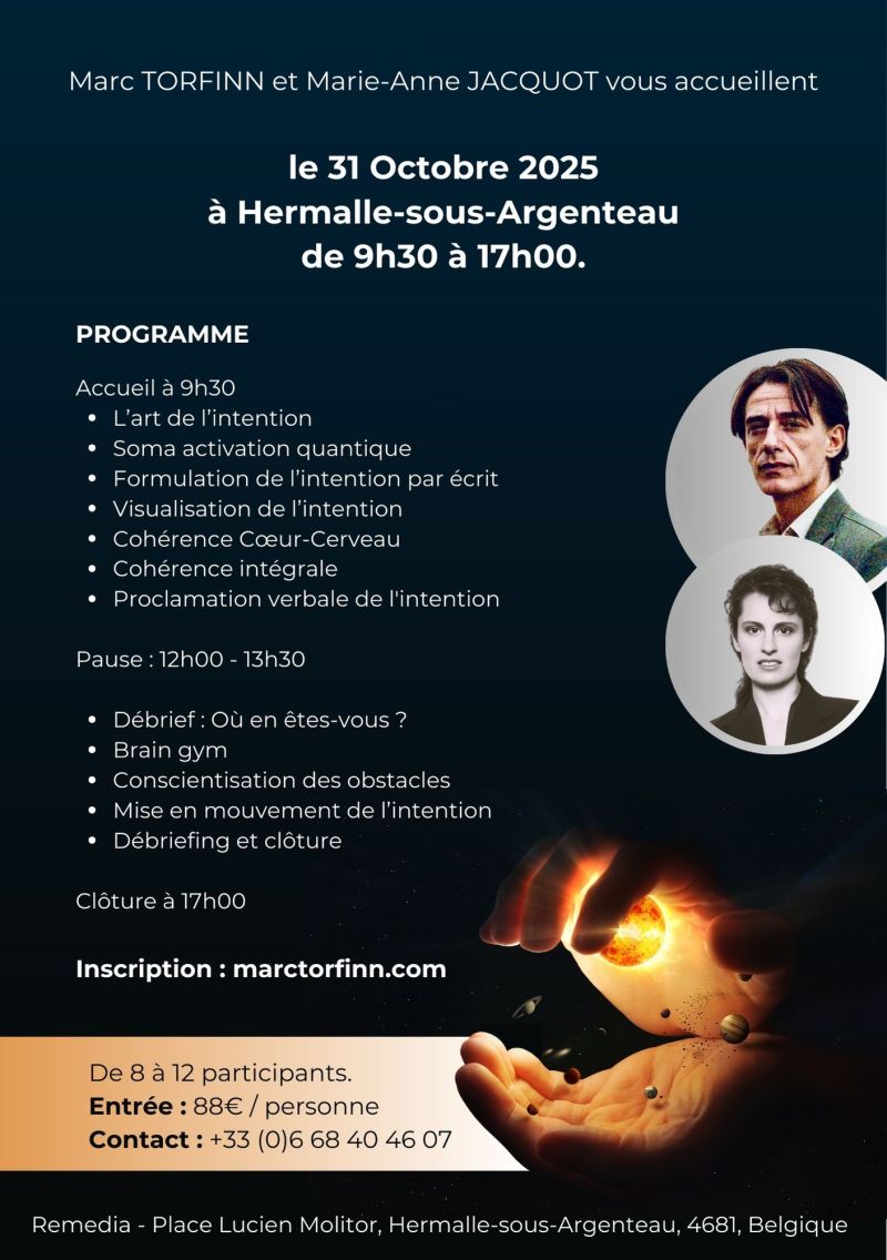 Suite à la parution de ses deux livres, « Du pouvoir de l’intention à l’art de la manifestation » et « Les lignes de temps - la prise de contrôle du double quantique », Marc Torfinn s’associe aux compétences complémentaires de Marie-Anne Jacquot pour co-animer une tournée d'ateliers-conférences en Belgique, du 21 octobre au 1er novembre 2025.